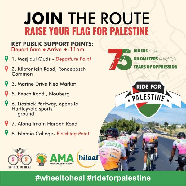 Why Your Presence Matters: The departure on Klipfontein Road marks the beginning of a powerful journey, symbolizing hope, strength, and healing. We urge you to stand along the route, especially on Klipfontein Road, to cheer on our cyclists. Wave Palestinian flags high, wear attire that reflects your support, and let our cyclists feel the collective strength of the community behind them.